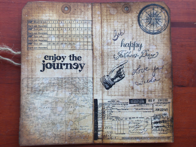 | The inside consist of a bunch of a father's day sentiment and travel related stamps that were embossed with black embossing powder. I used the spritz and flick technique to get the aged spots on the card. I used the large manila tags for each side, scored them to make space for a pen because I wanted to buy one of those antigravity pens for him to use in the plane. Unfortunately, every store around town has quit selling them and I didn't have time for delivery so it just became a card that looked like a book. |